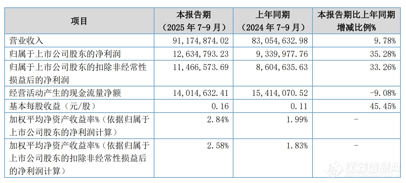 10月27日,海能技术(920476)发布2025年三季度报告,业绩表现亮眼。本报告期营业收入9117.49万元,同比增长9.78%,归属于上市公司股东的净利润1263.48万元,同比增长35.28%,归属于上市公司股东的扣除非经常性损益后的净利润1146.66万元,同比增长33.26%。